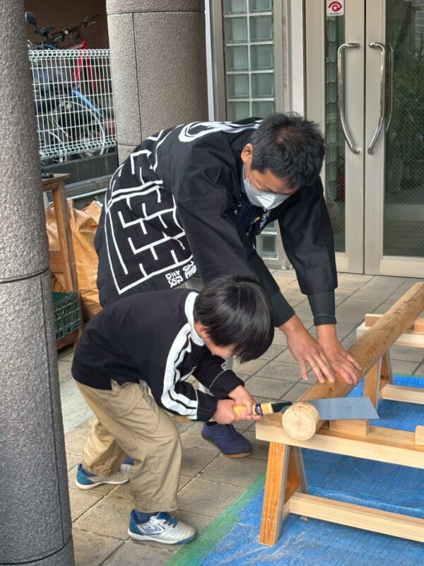 木工教室だけでなく、丸太を切ってコースターを作るコーナーと、かんな削りを体験できるコーナーも大盛況でした。