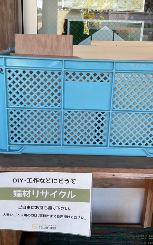 山田建設事務所前では、工事で余ってしまった端材を無料で配布しています。