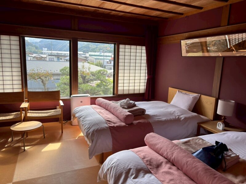 窓から剣山が見え、雄大な自然と街並みを楽しめる、素敵な宿でした。