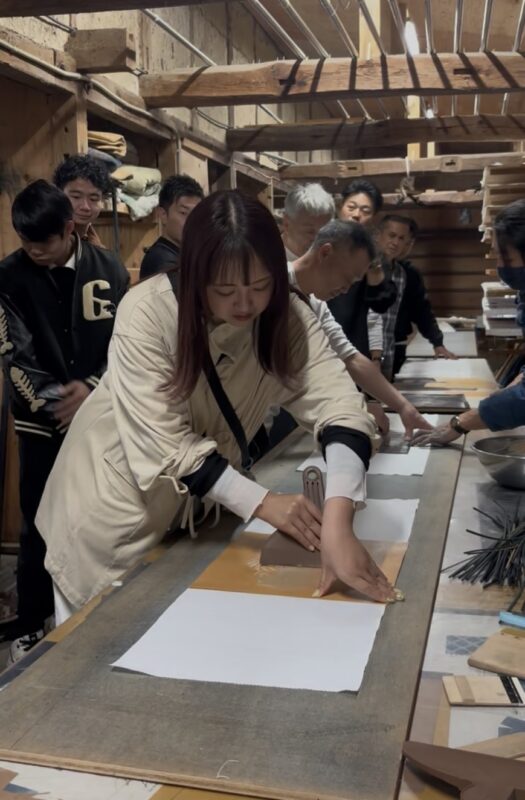 続いて、国内外で活躍する藍染め集団、BUAISOUさんで藍染めの体験を行いました。