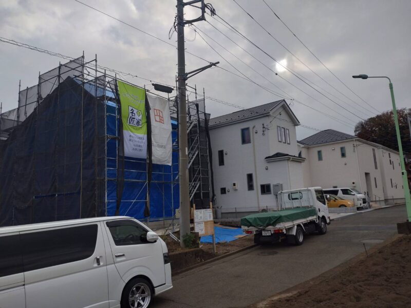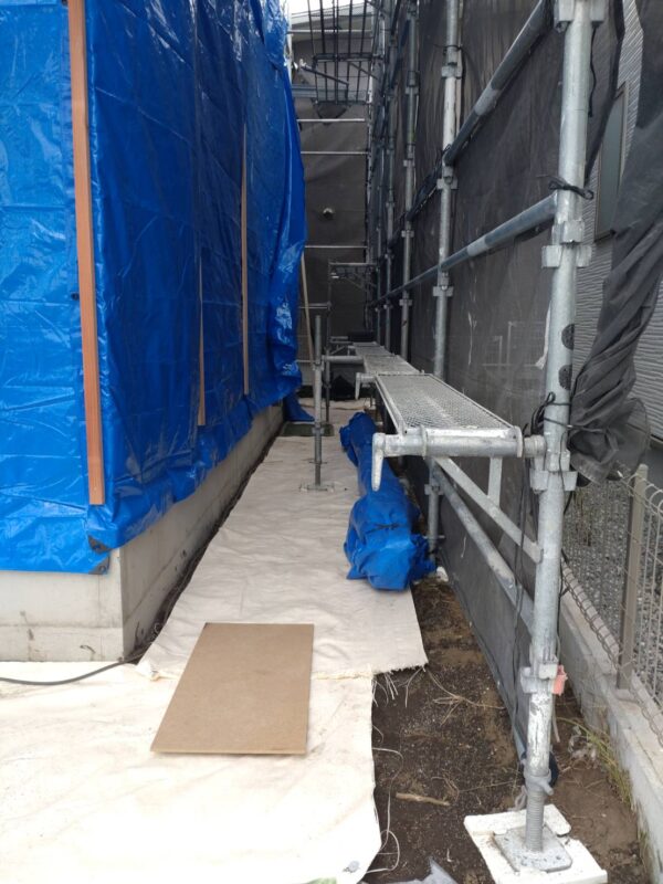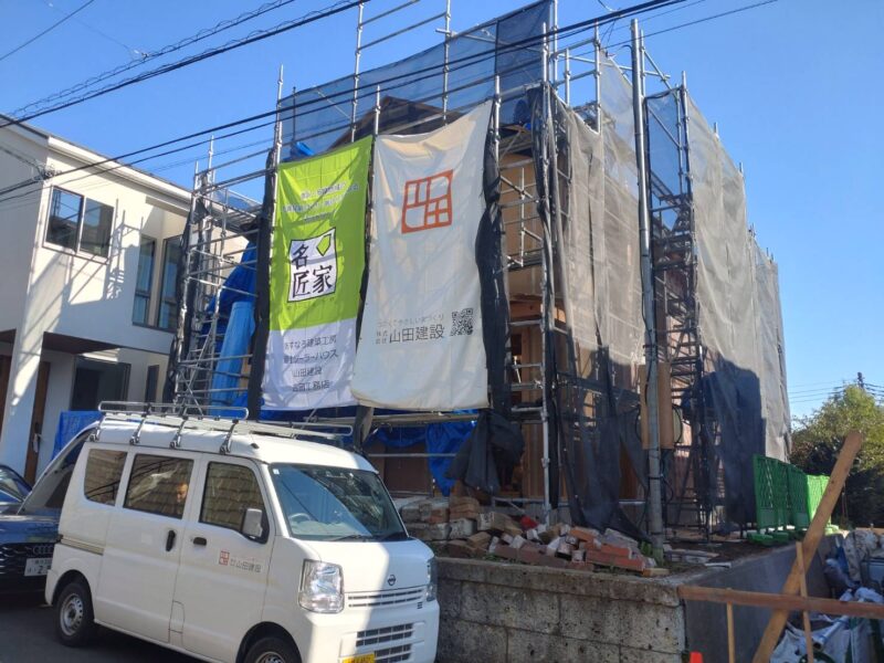 仮設足場、養生ネット、会社シート、名匠家のシート、現場看板は合格。
