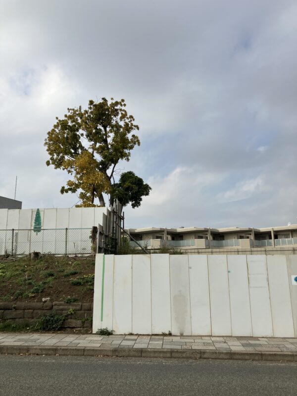 上の看板の後ろの木は、残された木と思われます。