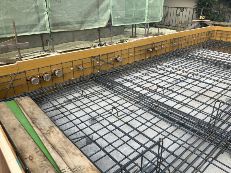 配筋検査では、スラブのピッチなど、構造図通りに出来ているか確認をします。