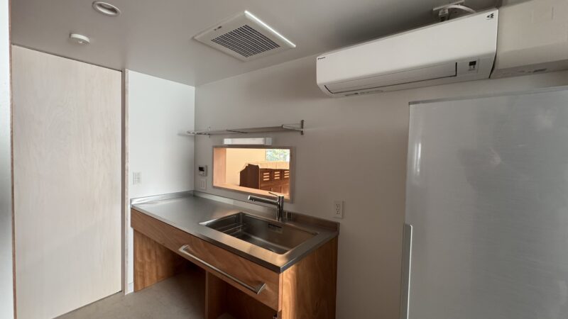 ↑ホール脇のミニキッチン カウンタの奥にはホールと繋がる小窓が計画されていました。