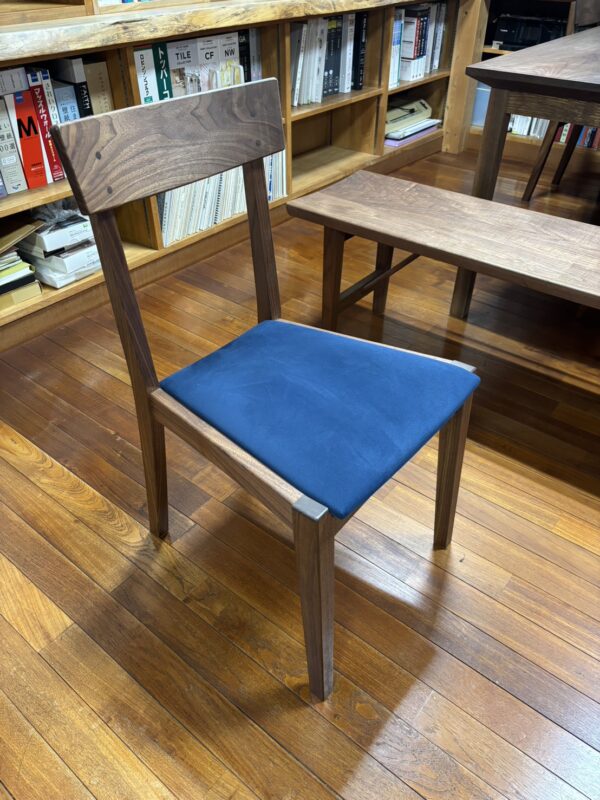 ウォールナットの渋く落ち着いた色合いに、少しレトロな青色がとても素敵で、心がビビッと動きました。