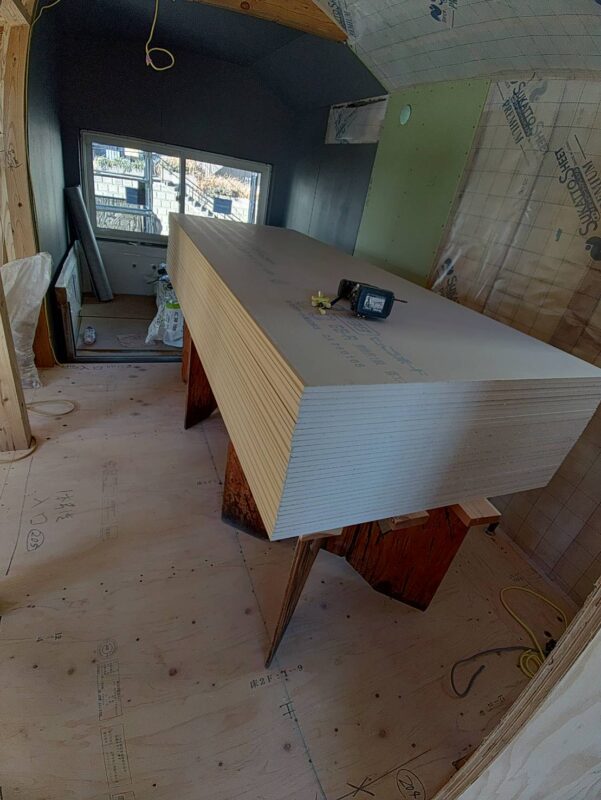 川崎市の抱陽の家では、室内カベボード貼りが始まりました。