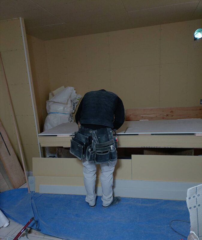 今回の現場では一階の天井、壁ボードをほとんど貼ってもらいました。