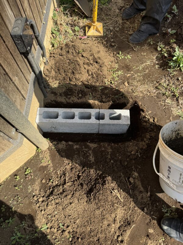 最初に写真のようにブロックが半分埋まるぐらいの穴を堀ります。