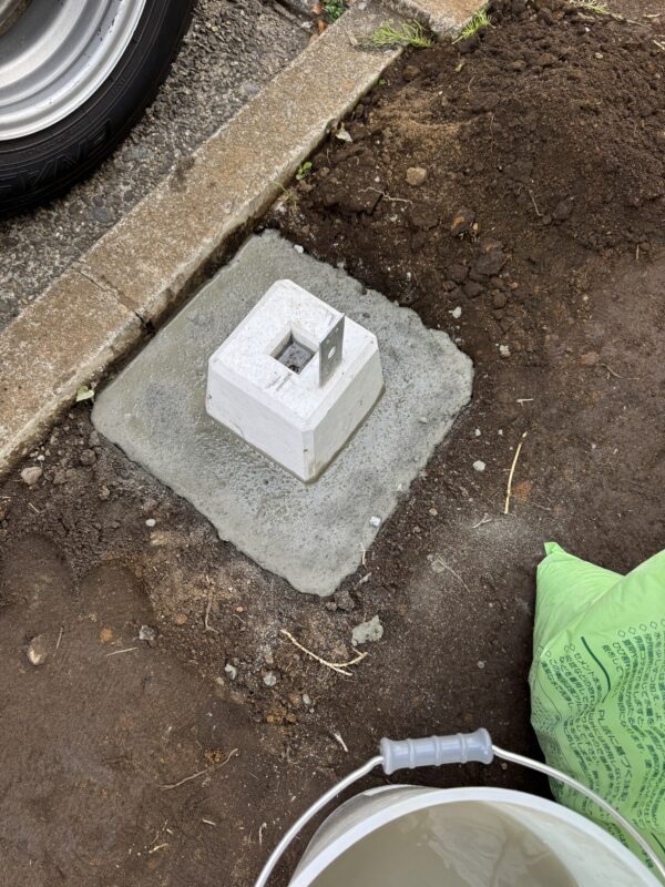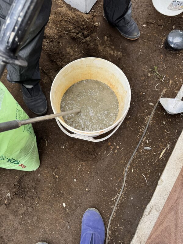 先ほど穴を掘ったところにモルタルを流し込み、棒などで突いて空気を抜きます。